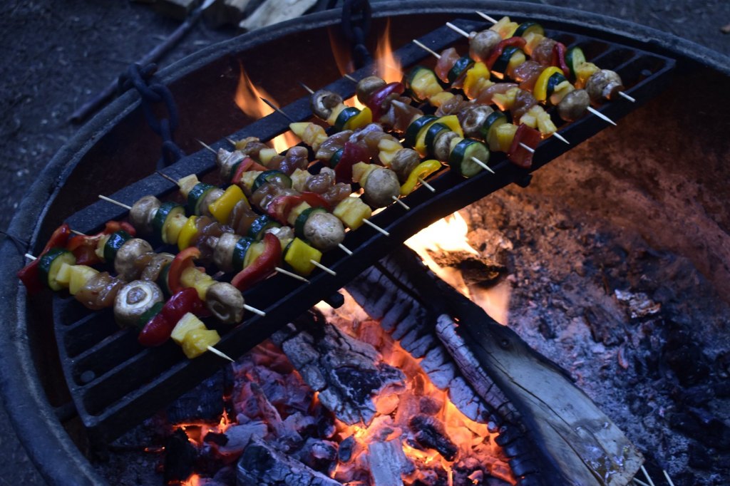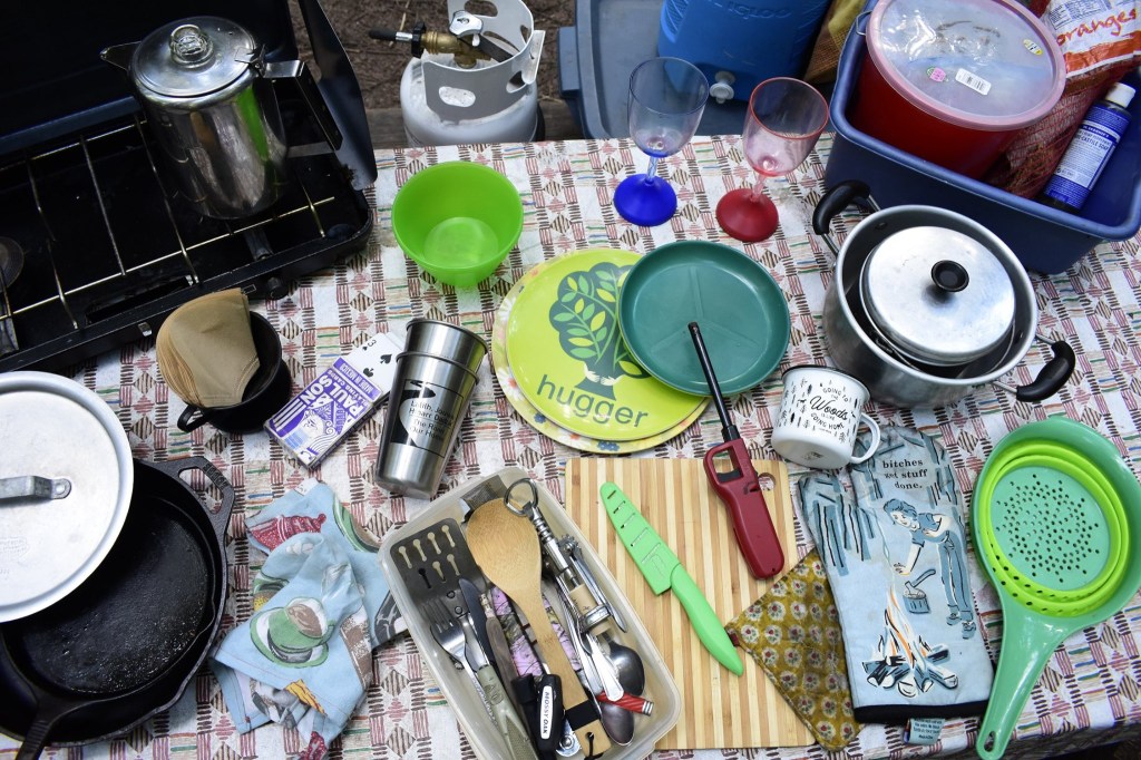 Once upon a time I’d pre make PBJ’s, bring a box of hot cocoa, maybe some hot dogs and marshmallows and considered myself (& family) ready for a campout.Not anymore. I need my veggies and…turns out… I LOVE CAMP COOKING…You can too. Now days I have a tote ready to go (best idea, ever!) with all my Kitchen needs- the utensils, pans, etc. and my Pantry – the spices and oils, and seasonings, plus a cook stove, water jug with spout, and a dish tub. Nearly glamping, but I still have to wash my own dishes.