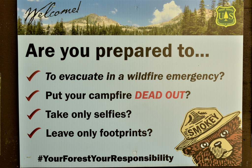 I try a different number. Our camp location is on the management line between two National Forests. This time I ring the adjacent National Forest, different land managers. This is a long shot. This Ranger Station is west of my location, not east where the billowing fire column could be seen. The phone is picked up immediately. I tell the voice at the other end my location, I tell her about the smoke column, I tell her my exact location and I ask if I should be concerned, should I leave. Astutely and assertively, she tells me only the sheriff can tell me/us to leave or issue an evacuation order – she can’t say.