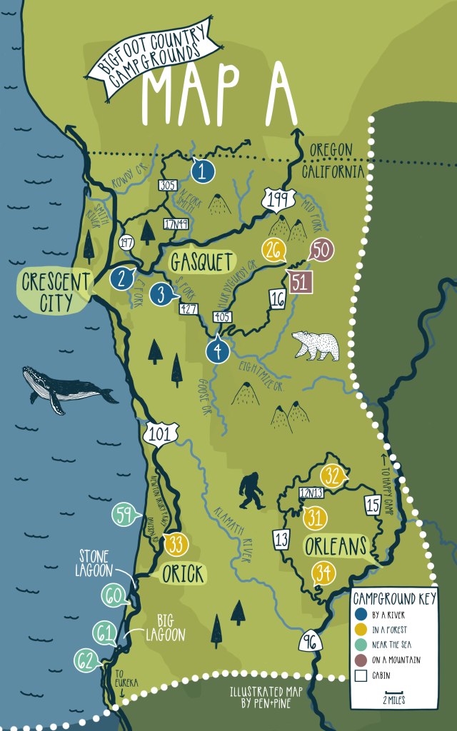 If you run your eye down the coastline of Wild Escape Guides Bigfoot Country Campgrounds Map A, you’ll bump into a little thumb or point of land projecting out into the Pacific Ocean. Here lies campground 62.